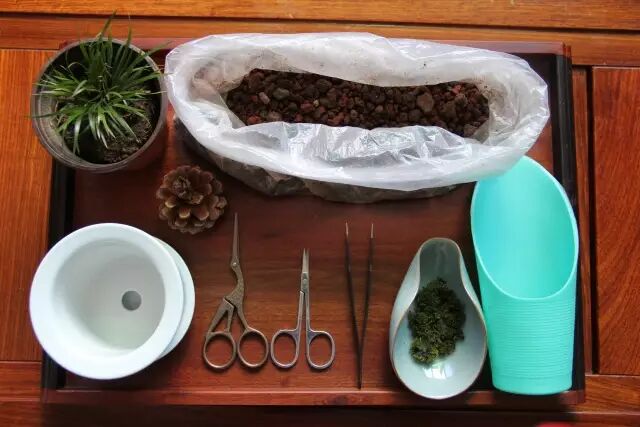金钱菖蒲一苗,白色瓷盆一个,颗粒植料若干,苔藓末若干,塑料铲筒一个,小剪刀两把,镊子一个……怎么还有一个松球?这货也是用来植菖蒲的?答案稍后揭晓,山人自有妙用!