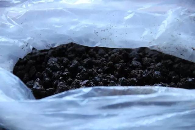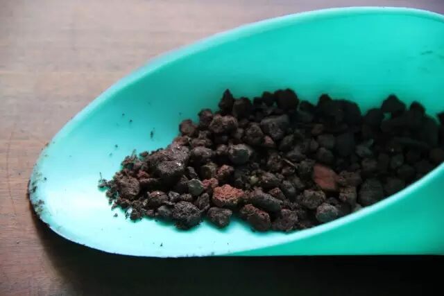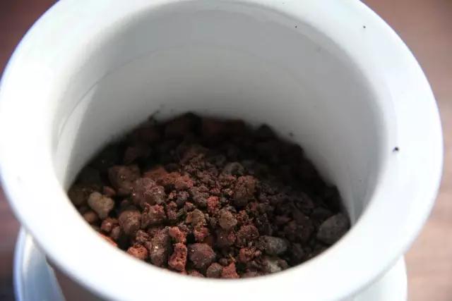 然后用铲筒挑选一些较大的植料颗粒放在蒲盆底部,这样有利于透水。