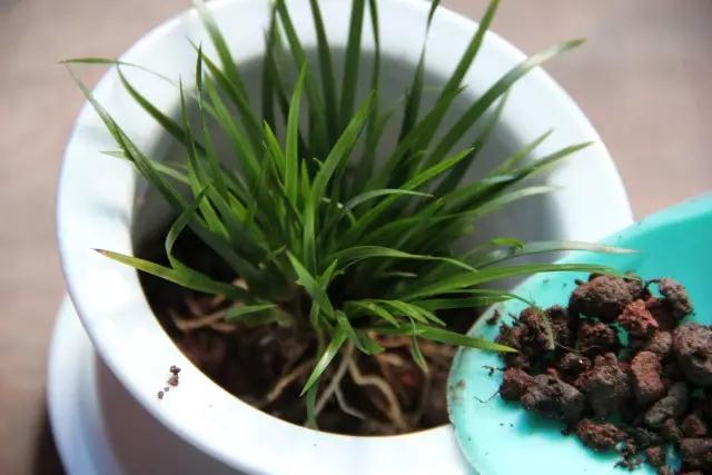 用铲筒往盆里倒植料时,注意从中间倒入,这样盆中心会自然形成一个小山头,然后将蒲根向四面分开,骑坐在小山头上,这样有利于蒲根与植料充分接触。