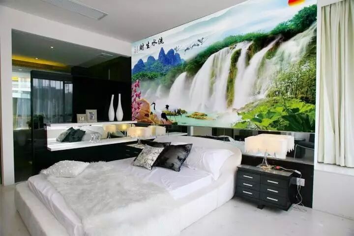 4、若鱼缸挨着墙壁,墙上可以挂上瀑布、大海之类的照片。象征财源生生不息,且难以计量;